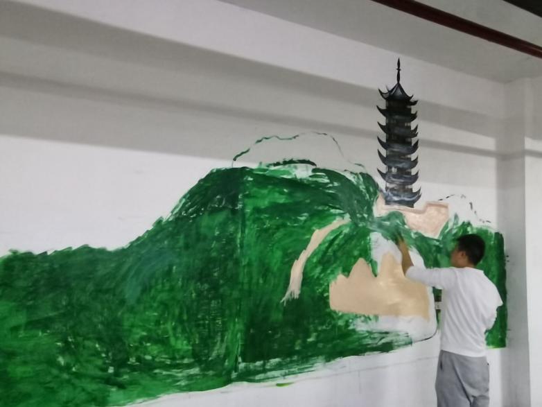 活动开始后,志愿者们用准备的好的工具,先在墙面上描绘基本的轮廓,再刷底漆,用细笔认真勾勒出线条,于调色板上细心调配好合适的颜色后进行大面积的着色,最终一副色彩鲜明,画面生动的金山风景跃然墙面上同时一副色彩鲜明,精神饱满的宣讲图深深刻印在每位成员的脑海中。活动在社区的大力支持和团支部成员的共同努力下,最终获得了社区人员和居民的一致认可。