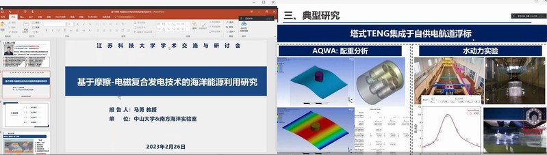 张建华教授以国家提倡的“双碳”战略为出发点,阐述了海上风电结构动力灾变分析方法及安全防护技术的重要性,以及其团队研究的“基于VFIFE的船舶海上结构物碰撞分析”的技术路线,针对研究理论与实际案例指出实现海上风电安全、可靠、经济开发的主要技术难点。马勇教授讲座围绕基于摩擦-电磁复合发电技术的海洋能利用研究的现状与发展趋势逐层展开,探讨海洋可再生能源开发的新思路、新领域和新趋势。