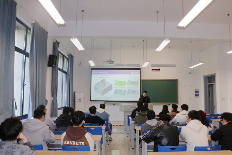 本次学术报告讲座着眼于冰覆盖航道中均匀流与浸没水平圆柱的三维相互作用。讲座伊始,杨毅锋博士强调了该领域在全球学术研究中拥有的广泛关注度,阐述了受限区域内波浪、水流、冰板与结构物之间相互作用研究的必要性。针对本报告内容,杨毅锋博士介绍了完全被海冰覆盖航道中水流与浸没结构物相互作用的数学模型,边界条件和冰板边缘支撑条件,讲解了基于线性化边界条件的格林函数推导过程,及基于源汇分布边界积分方程的数值解法。在结果讨论中,杨毅锋博士展示了冰板边缘支撑类型对冰面波形及结构物水动力特性的影响,分析了水动力学问题中至关重要的共振现象,详细阐明了不同类型共振频率对结构的影响。讲座最后,杨毅锋博士对目前研究课题的未来进行了展望,指出了明确的发展方向和广阔的应用前景,并鼓励在场的研究生参与到这个领域的攻坚克难中。提问环节中,杨毅锋博士一一对研究生提出的问题进行了逐一耐心解答,并就问题本身进行了拓展。