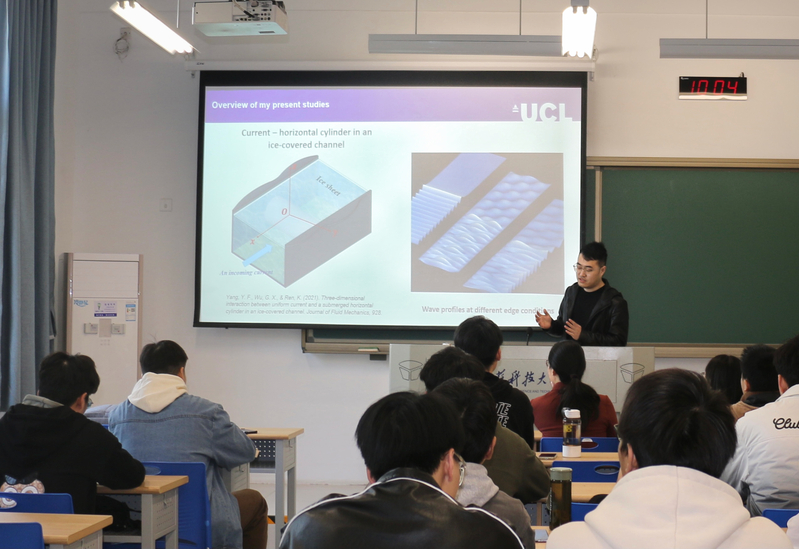 研究生教育肩负着高层次人才培育和创新创造的重要使命,为扩大研究生学术视野,切实提高研究生培育质量,4月9日上午,船海学院邀请伦敦大学学院(UCL)机械工程系博士杨毅锋在长山校区经世楼106教室开展了《冰覆盖航道中均匀流与浸没水平圆柱的三维相互作用》学术报告讲座。杨毅锋本科毕业于浙江大学,直接在UCL攻读博士学位,导师为国际著名流体力学专家、全球高被引学者和专家吴国雄教授,博士3年共计发表6篇国际高水平SCI学术论文,其中有2篇国际流体力学顶刊《Journal of Fluid Mechanics》,其推导的限制水域内弹性冰层格林函数是冰区水动力学领域的一项重要突破。