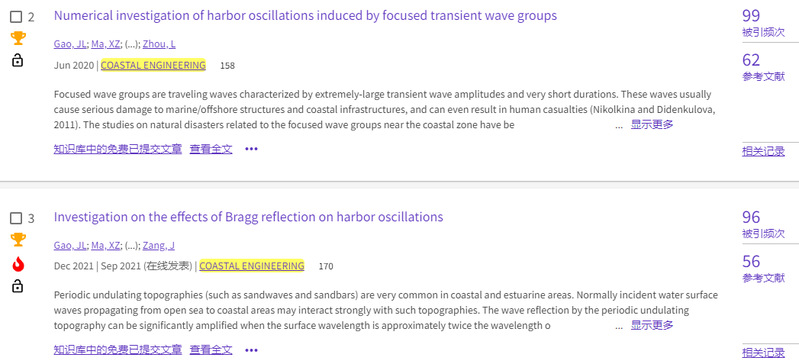 论文“Investigation on the effects of Bragg reflection on harbor oscillations”于2021年8月发表在中科院一区TOP期刊Coastal Engineering上,并于2023年3月首次入选“ESI高被引论文”和“ESI热点论文”,本次系连续第二期入选“ESI高被引论文”和“ESI热点论文”。论文“Numerical investigation of harbor oscillations induced by focused transient wave groups”于2020年2月发表在Coastal Engineering上,系首次入选“ESI高被引论文”。