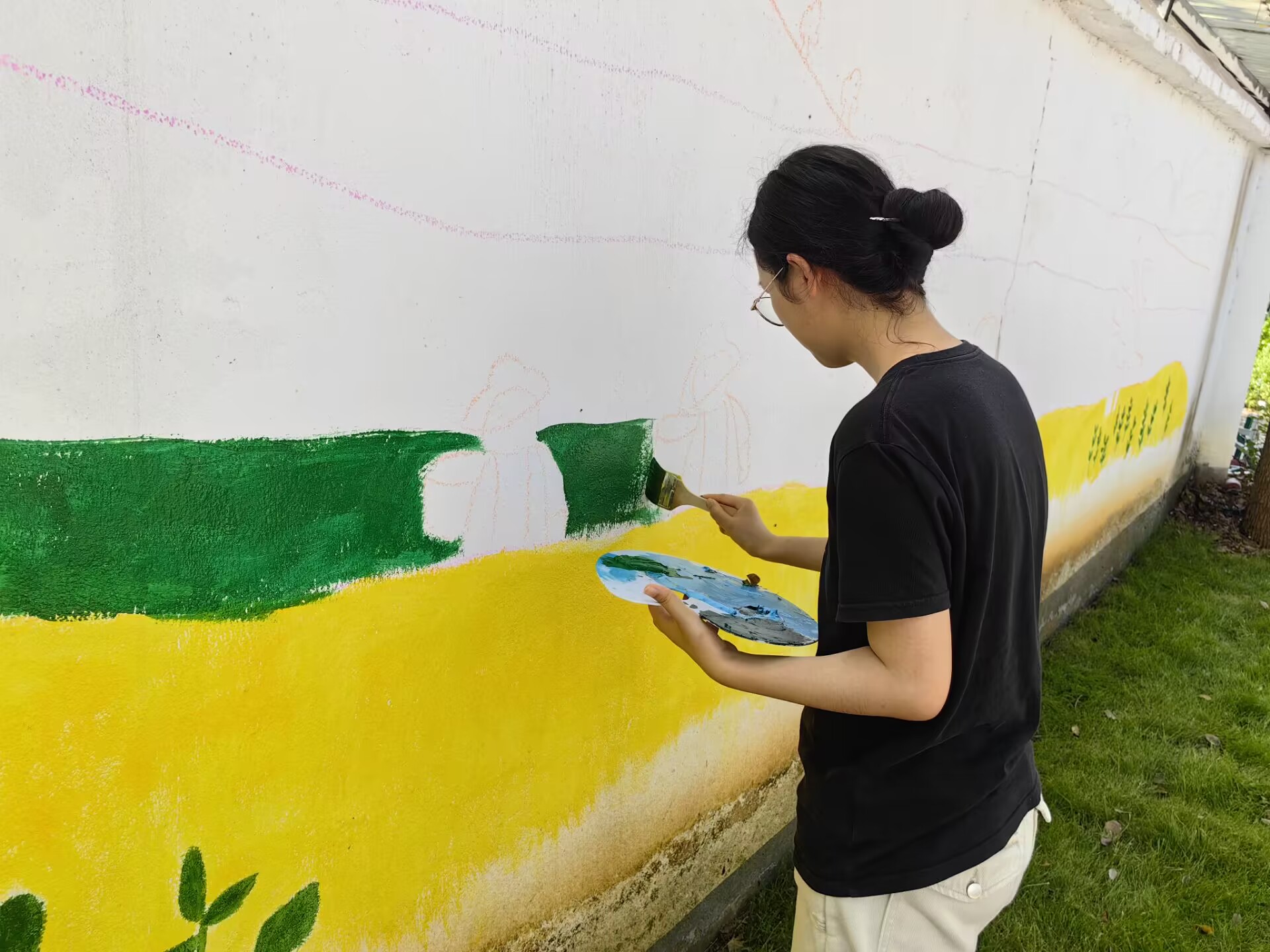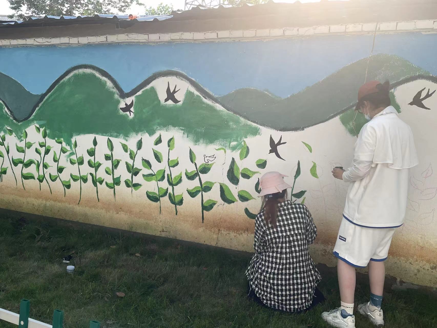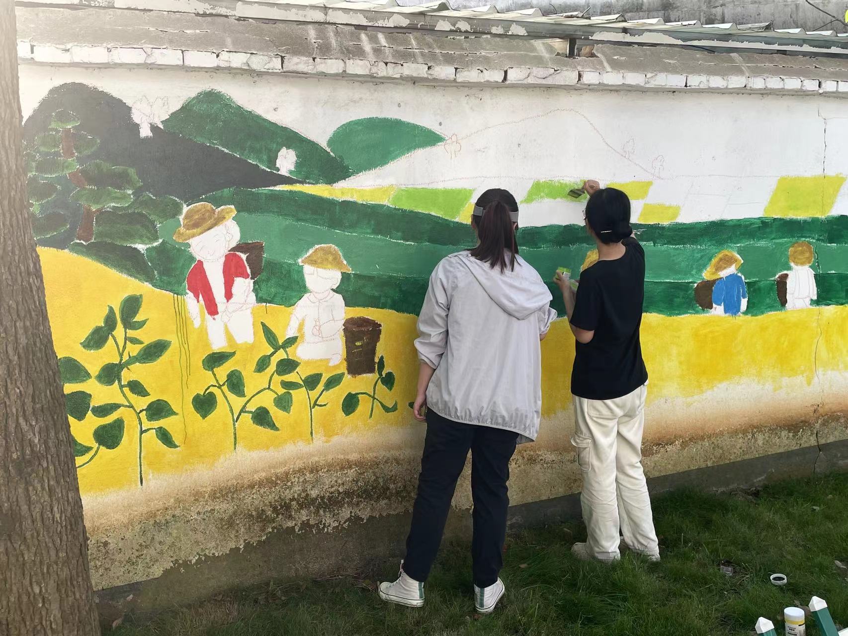 此次墙绘的对象是五洲山村进村口处的长约30米、高约2米的墙面。实践团成员经过前期与村委书记沟通后,结合村里的特色产业,最终确定用三幅主题不同的图画组成一整幅画,分别为五洲山村的乡土景色、劳作过程和收获的季节。整体而言,画幅以绿色为主要背景颜色,融合山水、树林、蓝天、飞鸟等能够展现特色村貌的意象,以此烘托五洲山村“幸福都是奋斗出来的”的文化。实践团在确认墙绘内容后,细化分工、责任到人、明确节点,绘制过程包括调配出所需的颜色、用粉笔画出轮廓、对其进行涂色等,经过一天的时间,一幅美丽的画卷跃然于墙上。