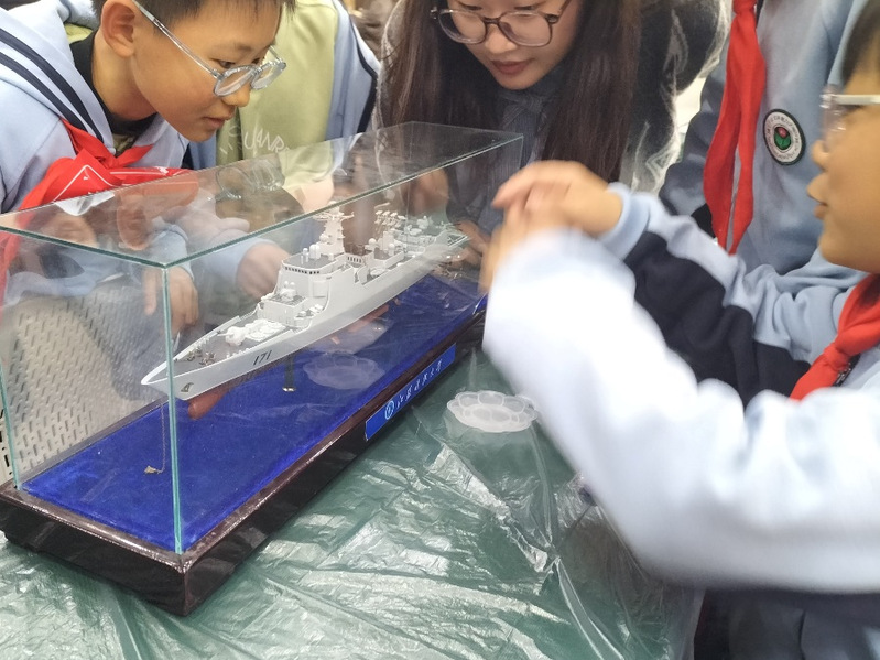 学生骨干们以“泰州号”、“海口号”驱逐舰等模型为教具,对其进行了详细介绍。这种直观学习比课本更震撼。许多孩子第一次理解了“万吨大驱”背后的技术突破。“原来每一艘军舰都是科技的‘变形金刚’!”同学们感慨道。通过互动问答环节,又激发青少年对海军科技的兴趣,传递“海洋强国”理念。活动强调,海军的强大不仅是国防实力的象征,更是民族自豪感与凝聚力的源泉,呼吁大家关注海洋、支持海军建设,共同守护蓝色国土。
