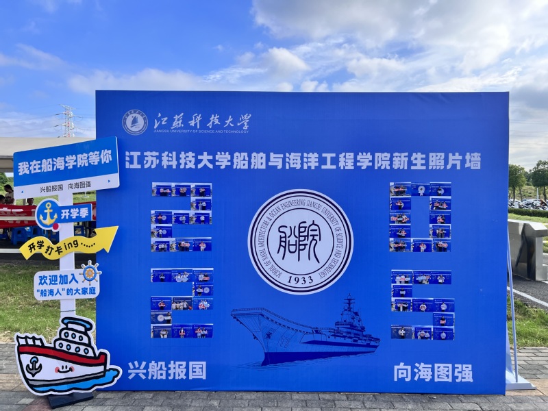 9月13日至14日,船海学院迎新点洋溢着热烈氛围。学院创新性设置新生照片墙,以蔚蓝色海洋为背景,点缀帆船、灯塔等航海元素,寓意扬帆远航,乘风破浪的美好期许。现场安排专业摄影师为每位新生拍摄入学纪念照,通过即时打印技术赠送实体照片,让新生在镜头前定格与船海学院的初见瞬间。