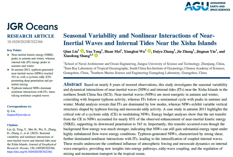 近日,我院教师刘倩副教授在海洋科学领域国际权威期刊Journal of Geophysical Research: Oceans 发表高水平研究论文《Seasonal Variability and Nonlinear Interactions of Near-Inertial Waves and Internal Tides Near the Xisha Islands》。该研究成果揭示了南海海域近惯性波与内潮波的季节性变化规律及其在台风作用下的非线性耦合机制,为进一步理解热带海洋能量传输、海洋混合以及物质输运提供了新的科学认识。
